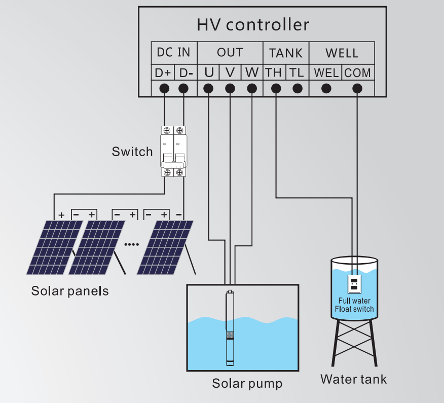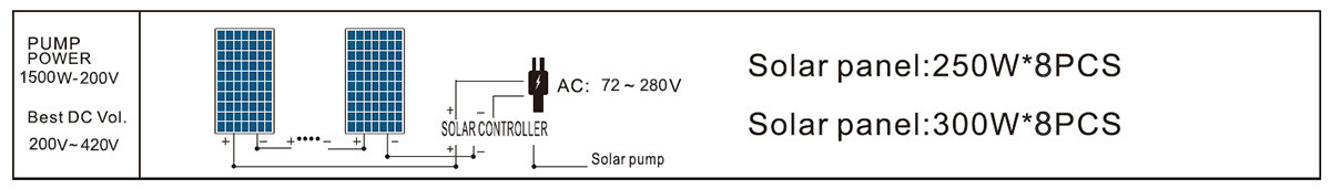 The solar PV system voltage needs to meet the voltage range in the figure below. For example: The 4DPC6-56-110-750-HV model matches the solar panel voltage between 120V~420V.