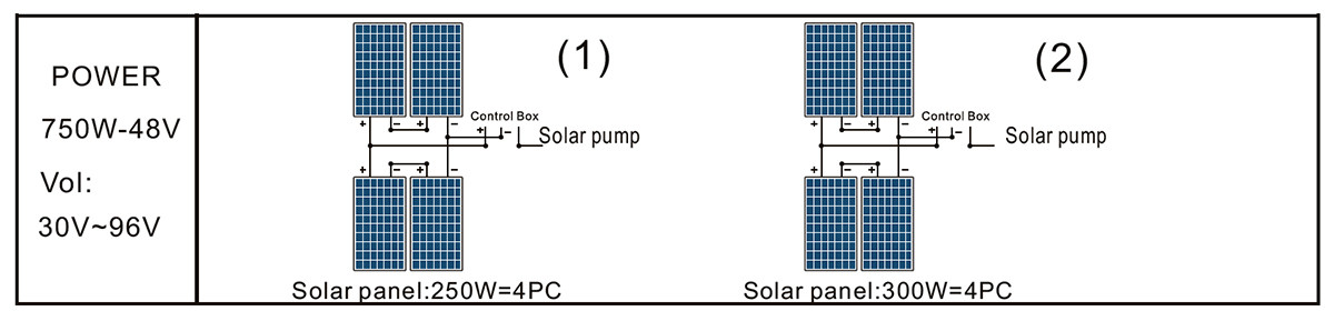 The solar PV system voltage needs to meet the voltage range in the figure below. For example: The 3DPC3-35-24-300 model matches the solar panel voltage between 18V~48V.